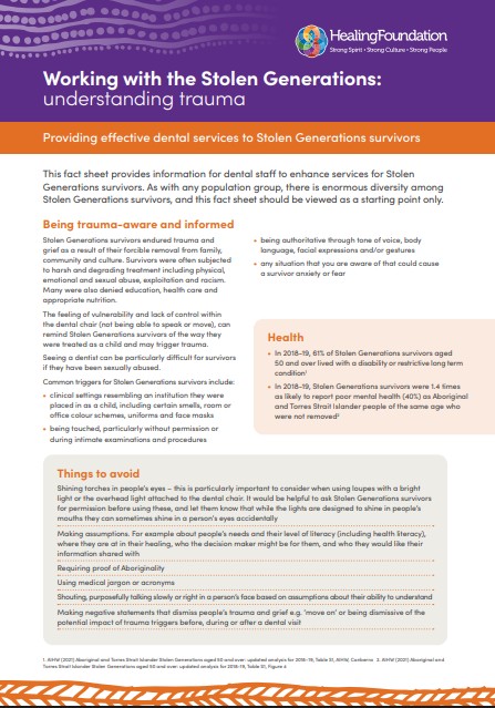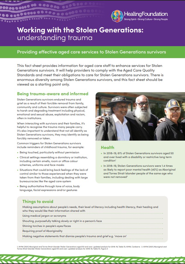 The Healing Foundation has developed guidance for health and aged care service providers on working with Stolen Generations survivors, underpinned by a trauma-informed and culturally safe approach.