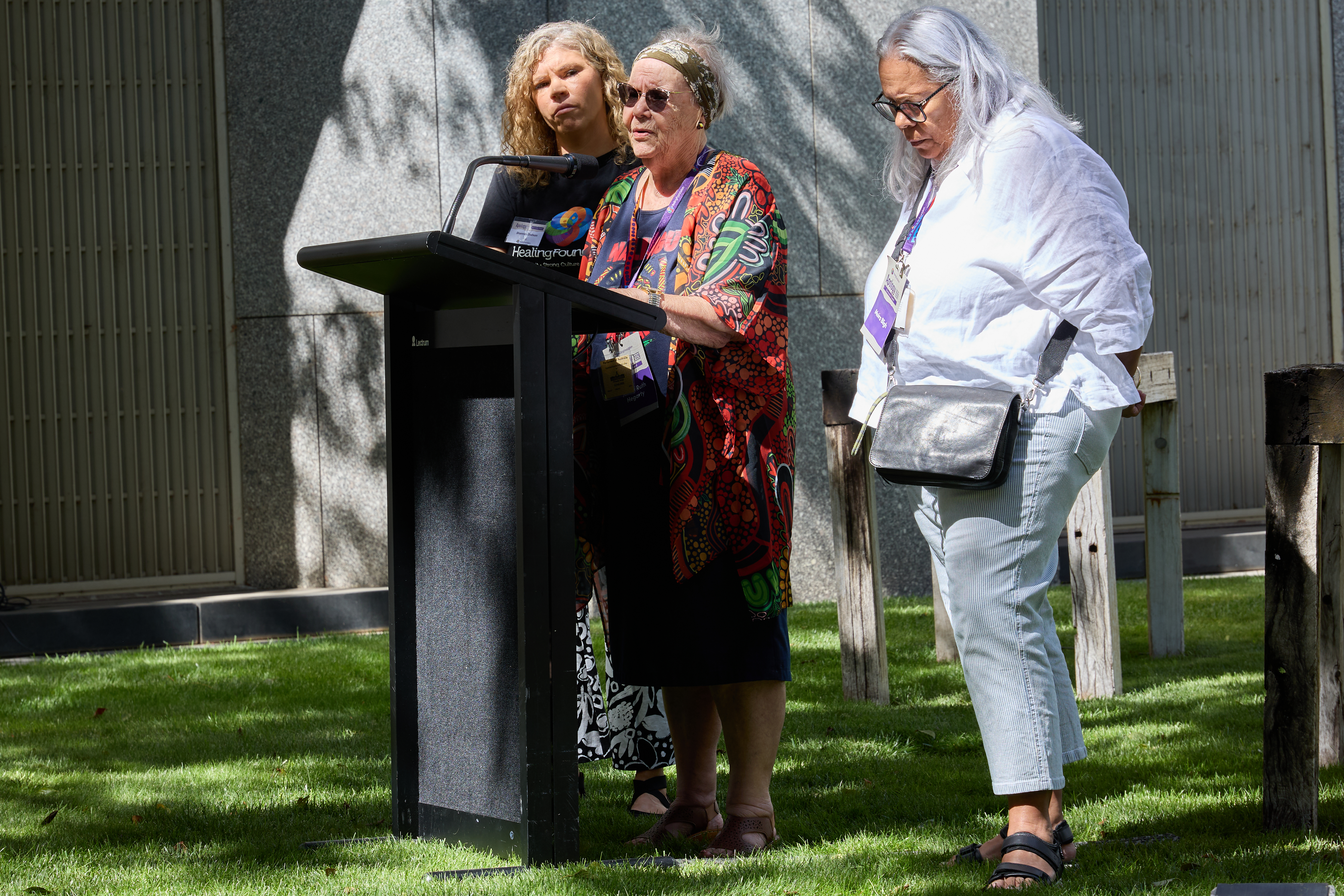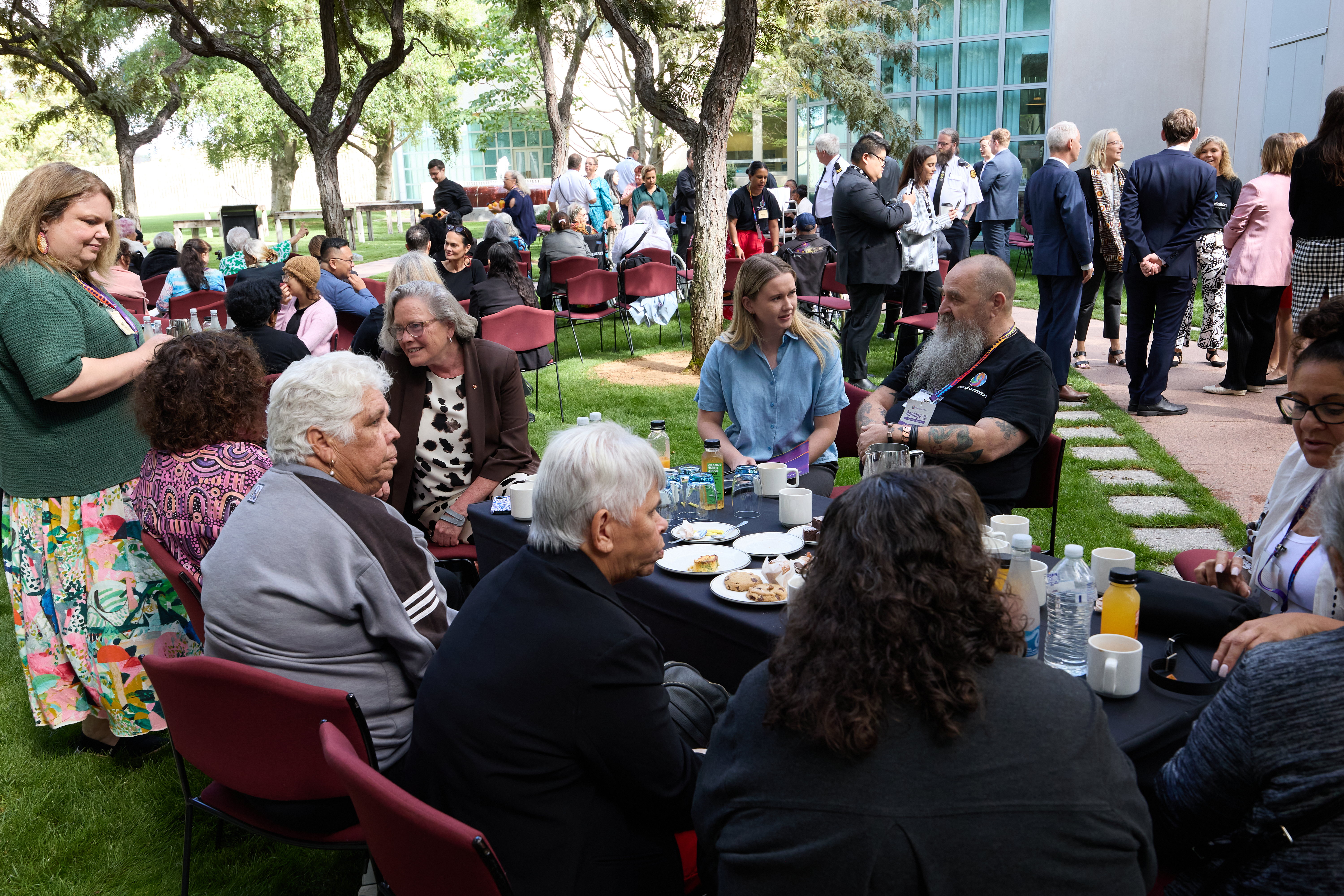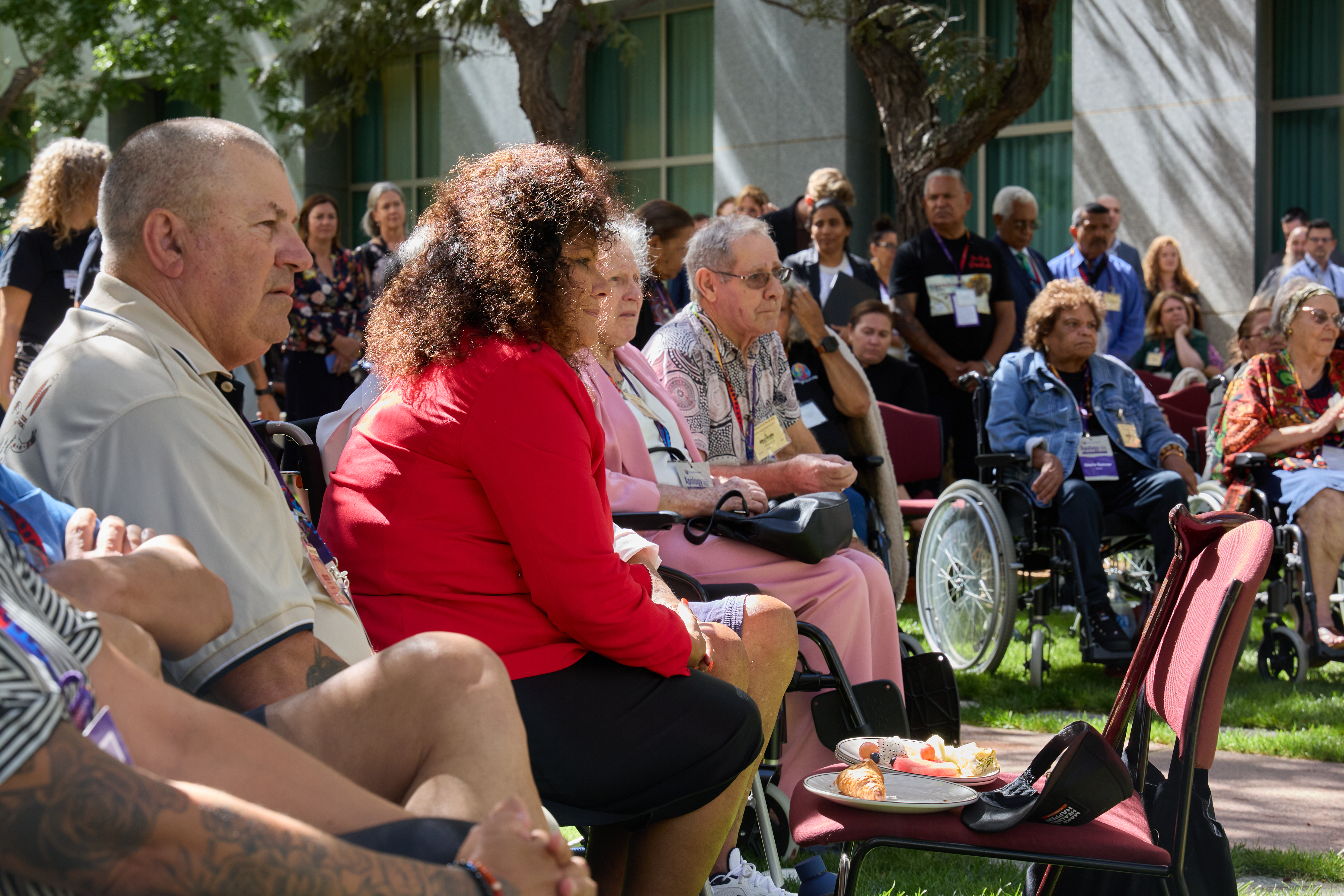 Well known author and activist, Aunty Ruth Hegarty, 97, travelled from Queensland and addressed the crowd of politicians, survivors and support people at the morning tea co-hosted by Minister for Indigenous Australians Malarndirri McCarthy and The Healing Foundation.